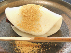 「こがねもち」種を使っています。かけてあるきな粉は京都から取り寄せた香ばしい風味の「黒須きな粉」です。つぶ餡、お餅、きな粉だけのとてもシンプルな